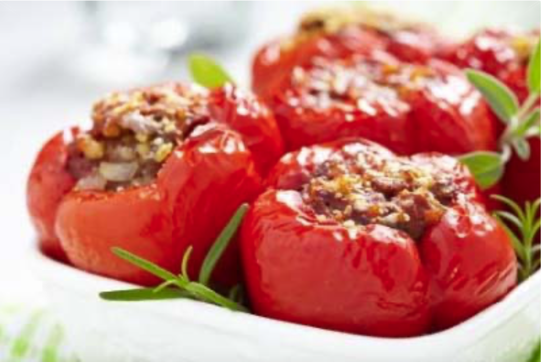 In this light, summery, Italian-inspired supper we’ve stuffed tender red peppers with a moreish mixture of fluffy rice, buttery pine nuts, walnuts and a bit of zip of aromatic herbs.