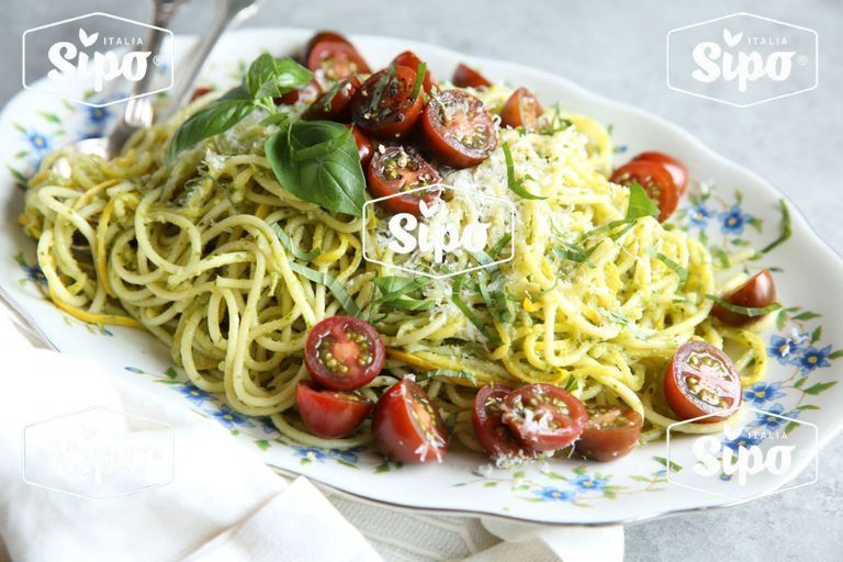 Drain and transfer spaghetti back to the stock pot and mix in Pumpkin Pesto Fresco SIPO. Transfer to a large platter and top with Parmigiano Reggiano and tomatoes. Drizzle with olive oil, garnish with pepper and serve.